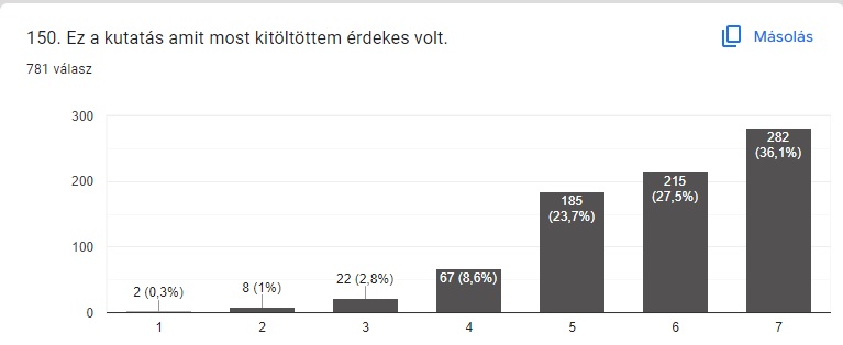 Tehát volt a mostani kérdőív, 819-en kezdték kitölteni, annak ellenére, hogy nagyon hosszú volt 781 válaszadó töltötte ki teljes mértékben. A kérdőív hosszát is figyelembe véve ez a minta a kutatás egyedülállóan nagy támogatottságát mutatja. A válaszadók többsége (mintegy 90%) férfi. Azok aránya, akiknek a kedvenc csapata az NB I (OTP Bank Liga) keretein belül játszik, 88,3 százalék. A válaszadók átlagos életkora 39,31 év, a kitöltők 43,3 százaléka saját megállapítása szerint a kedvenc csapata hazai mérkőzéseinek legalább 80 százalékán részt vesz. Azaz valóban a szurkolókat sikerült elérni – ilyen kutatásról én nem tudok. A szurkolók a kérdőívről (még az adattisztítás előtt), így értékelték a kutatást (fenti kép). 2024 első félévének feladatai, a tézis megírása, a kutatás eredményeinek vizsgálata, a honlap átalakítása, további frissítése, publikációk megírása, oktatás, egyetemi feladatok, (az eddigi eredmények alapján) újabb kutatás előkészítése és külön a tudományos világtól a labdarúgás, mint projekt támogatásának előkészítése - hátha valakit érdekel -.