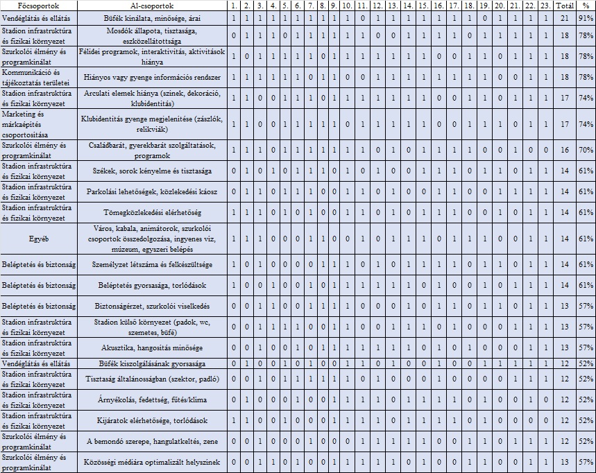 A kutatás végével azt kértem a jelenlévőktől, hogy legyenek tiszteletteljesebbek a szurkolóikkal, melyet problémaként a kutatás is megmutatott, illetve 3 dologra hívtam fel a figyelmet abban bízva, hogy meghallgatásra talál. 1) a város-klub-Videoton-szurkolóknak meg kellene találni egy közös minimumot, ami mentén elindulhat egy közös együttműködés. Rengeteg a kibeszéletlen helyzet, melyeket fel kell hozni és meg kell oldani 2) a polgármester úr által elmondottakra reflektálva ("nem a város szándéka üzemeltetni a klubot", "egy év alatt új tulajdonos kell"), jeleztem, hogy nagyon sok az üres szektor, foglalkozni kellene a piacbővítéssel, a márka menedzselésével és a márkaértékkel, a szurkolói élmények megteremtésével, megyei és megyén kívüli kapcsolatok kiépítésével és nem csak arra várni, hogy bejöjjenek szurkolók, emberek. Ez alap érdek, kiemelt feladat, ha a terméket értékesíteni akarják egy piaci befektetőnek, mindezt megfelelő értékért. 3) az elmúlt félévben Fehérváron oktattam, a hallgatóimnak azt a feladatot adtam, hogy - tisztelve a klubot - saját szakmai látásukkal nevezzenek meg olyan sportszolgáltatási helyzeteket, amelyeket negatívnak, problémásnak, javítandónak gondolnak. 23 hallgató 491 problémát nevezett meg (az ankéton rossz számot mondtam, elnézést), amit csoportokba (10+1) rendeztem. A hallgatók által leggyakrabban azonosított, visszatérő szurkolói elégedetlenséget tükröző jelenségek ezek alapján,a ’Beléptetés és biztonság’, ’Biztonságérzet, szurkolói viselkedés’, ’Vendéglátás és ellátás’, ’Higiénia és komfort’, ’Stadion infrastruktúra és fizikai környezet’, a ’Kereskedelem és merchandising’, a ’Szurkolói élmény és programkínálat’, a Marketing és márkaépítés’, valamint a ’Szurkolói élmény és programkínálat’, illetve 'Egyéb'. Ezeket sorrendbe raktam, amit az alábbi táblázat mutat. Ezt megosztottam a várossal (mint új tulajdonos), abban bízva, hogy a szurkolók kiszolgálása javulni fog. Végezetül ismételten felhívtam a jelenlévők figyelmét a szurkolók megbecsülésének kiemelt fontosságára.
